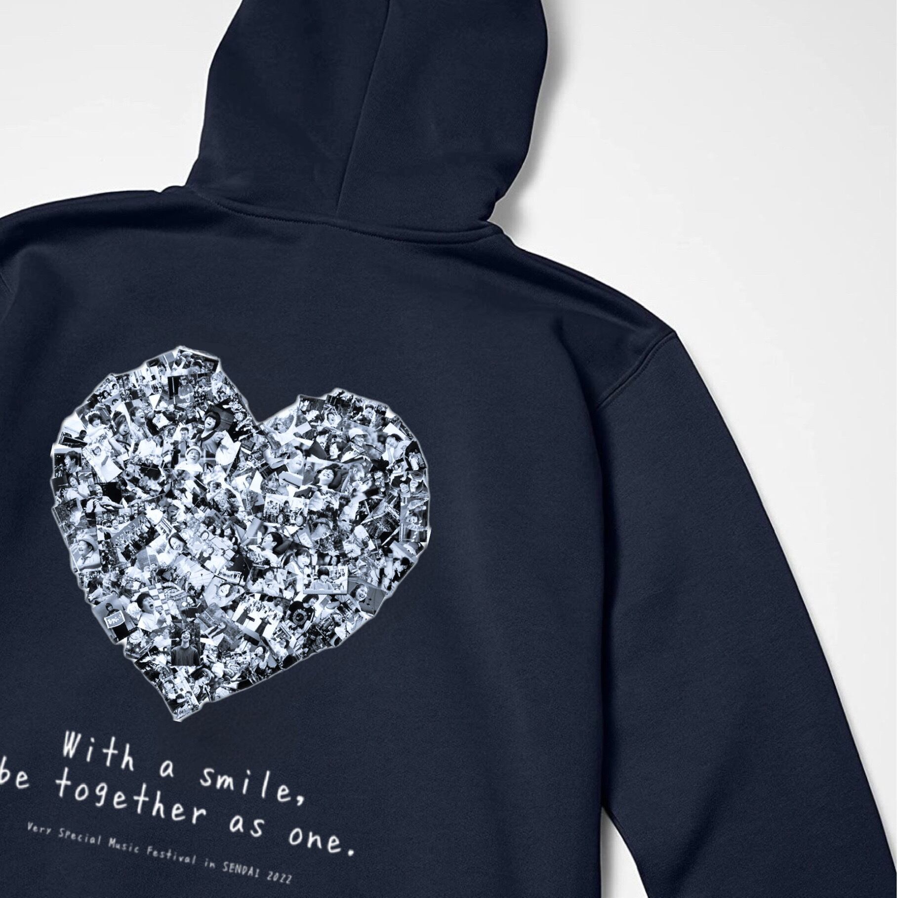 2022ポスターのメインビジュアルである、みなさんの笑顔の写真でできたハートを、クールなネイビーカラーのパーカーに、ホワイトカラーでバックプリント。